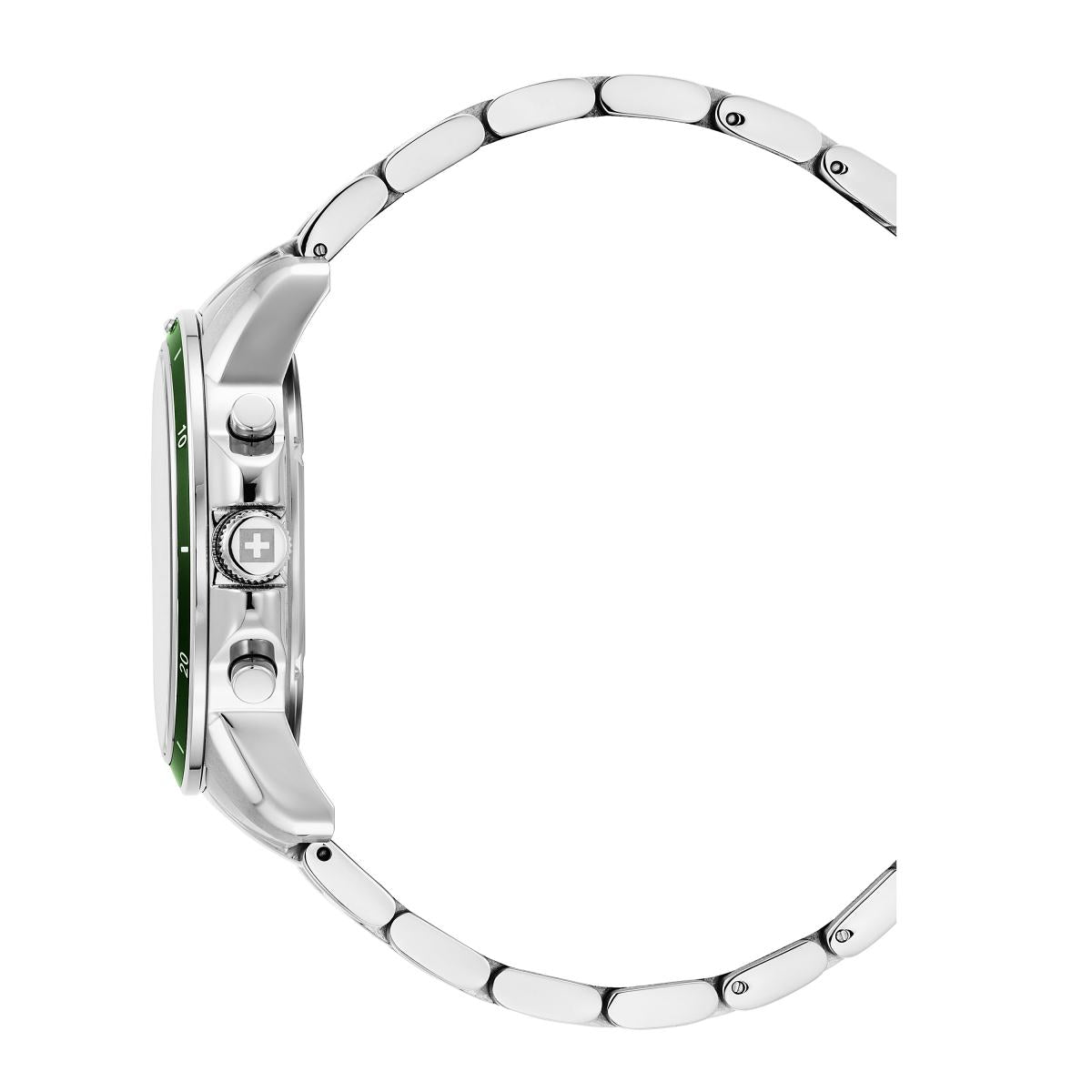 Gehäuse: | Edelstahlgehäuse silberfarben, Lünette Grün, Durchmesser : ca. 4,4 cm, Stärke: ca. 1,2 cm, Gewicht: ca, 193 Gramm |